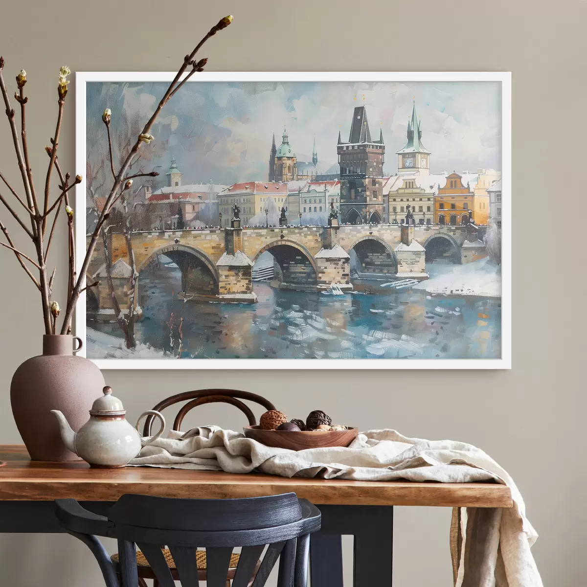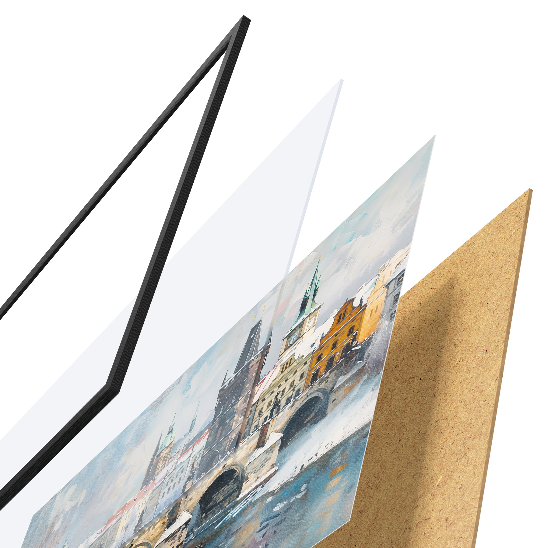 De poster bestaat uit een frame, plexiglas, geprinte afbeelding en spaanplaat achterkant. De poster kan meteen aan de muur worden gehangen dankzij de bevestigingen op de achterkant.
