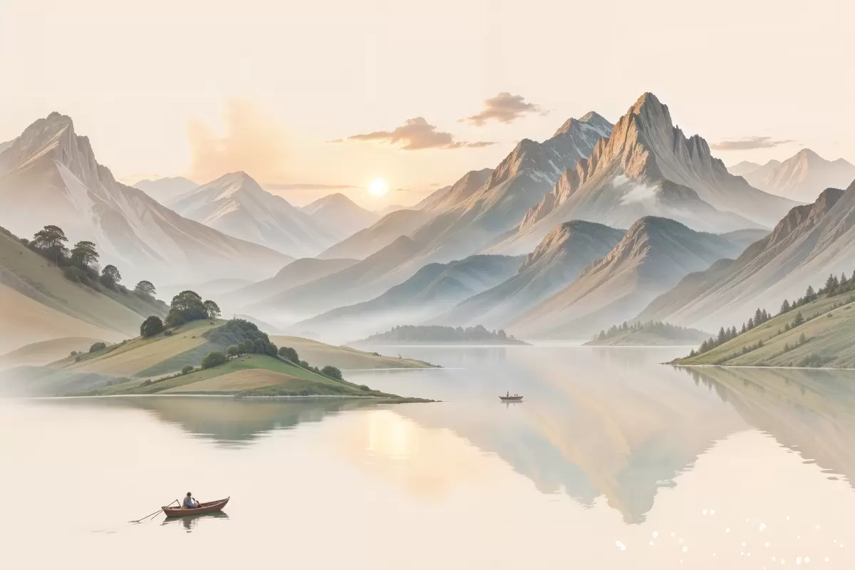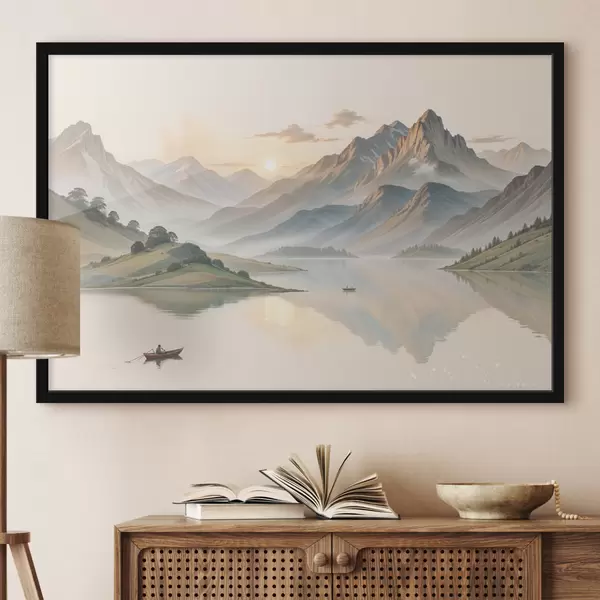 Poster Een sereen landschap met een meer dat bergen op de achtergrond weerspiegelt, met een kleine boot op het kalme water Nr f40391