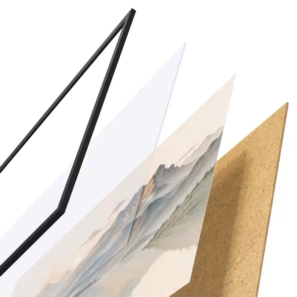 De poster bestaat uit een frame, plexiglas, geprinte afbeelding en spaanplaat achterkant. De poster kan meteen aan de muur worden gehangen dankzij de bevestigingen op de achterkant.