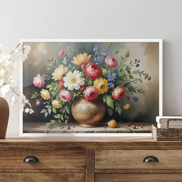 Poster Een levendig schilderij van een boeket kleurrijke bloemen, waaronder rode rozen, gele narcissen en witte madeliefjes Nr f40395
