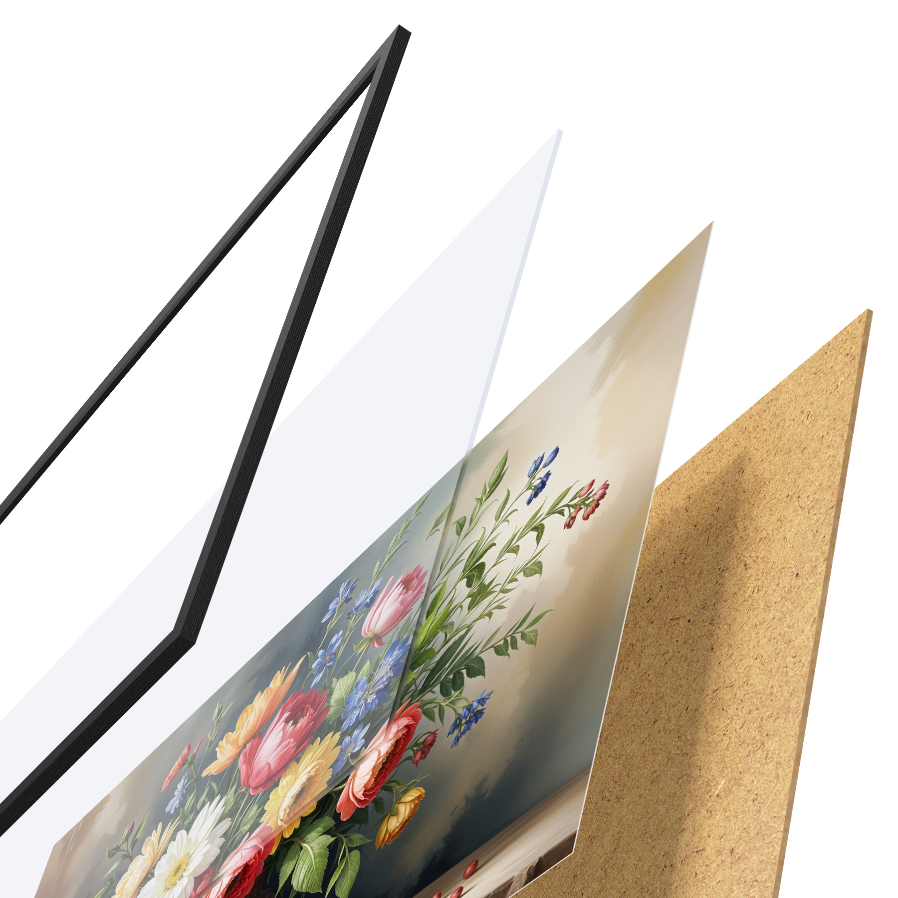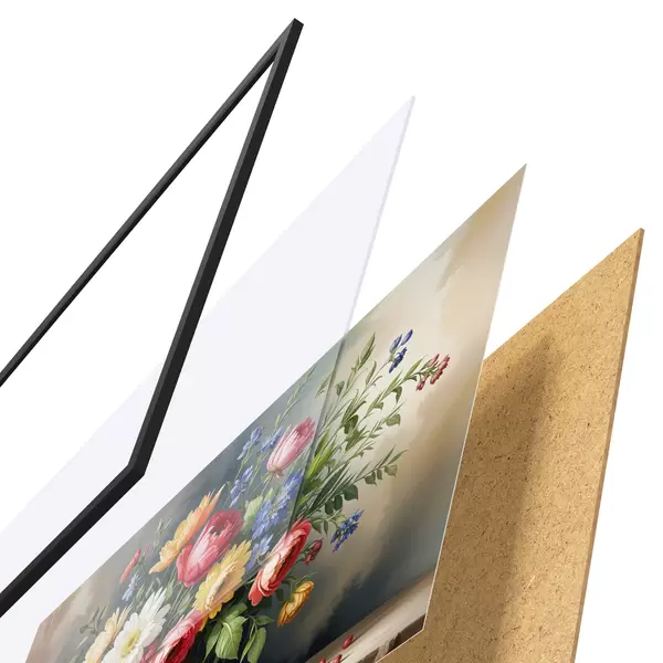 De poster bestaat uit een frame, plexiglas, geprinte afbeelding en spaanplaat achterkant. De poster kan meteen aan de muur worden gehangen dankzij de bevestigingen op de achterkant.