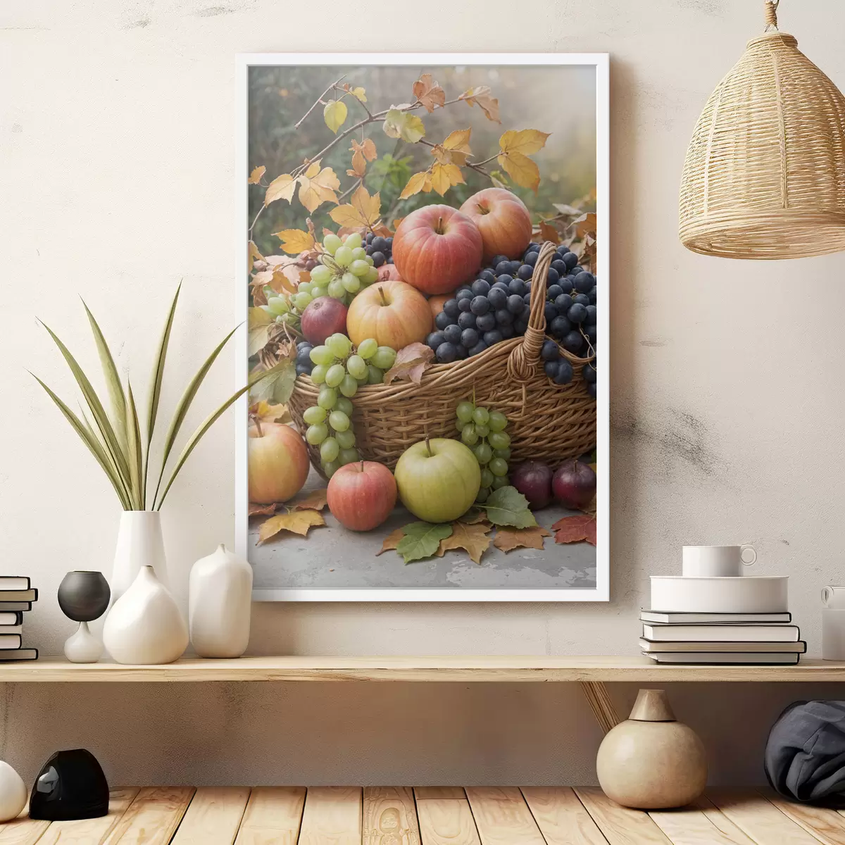Poster Een mand gevuld met verschillende herfstvruchten, waaronder appels, druiven en peren, omringd door gevallen bladeren Nr f40409