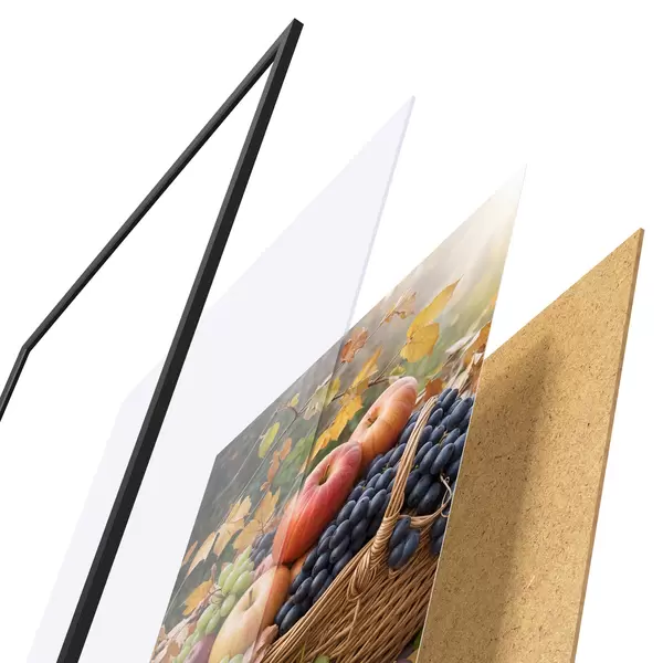 De poster bestaat uit een frame, plexiglas, geprinte afbeelding en spaanplaat achterkant. De poster kan meteen aan de muur worden gehangen dankzij de bevestigingen op de achterkant.