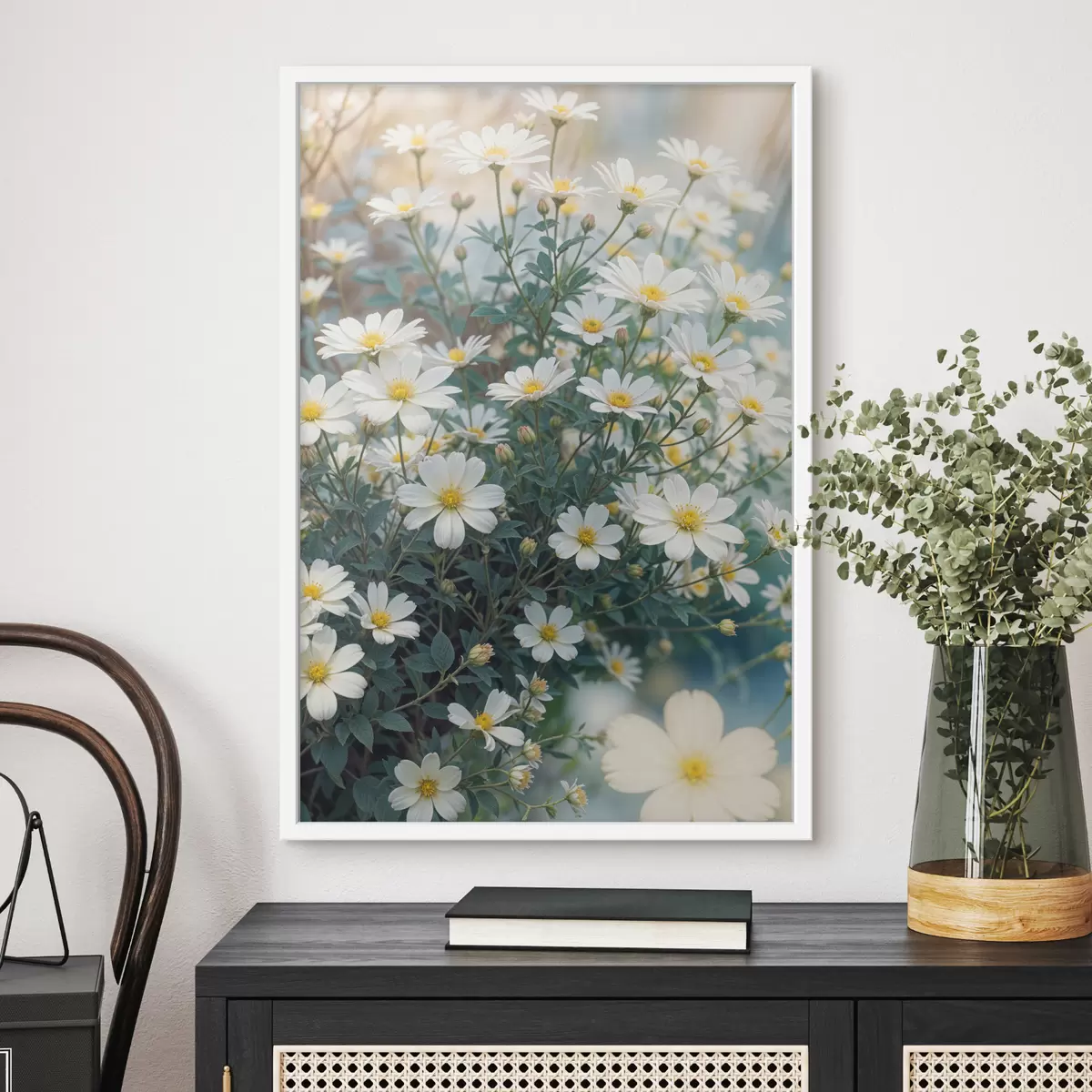 Poster Een veld met witte madeliefjes met groen blad, tegen een wazige achtergrond Nr f40413