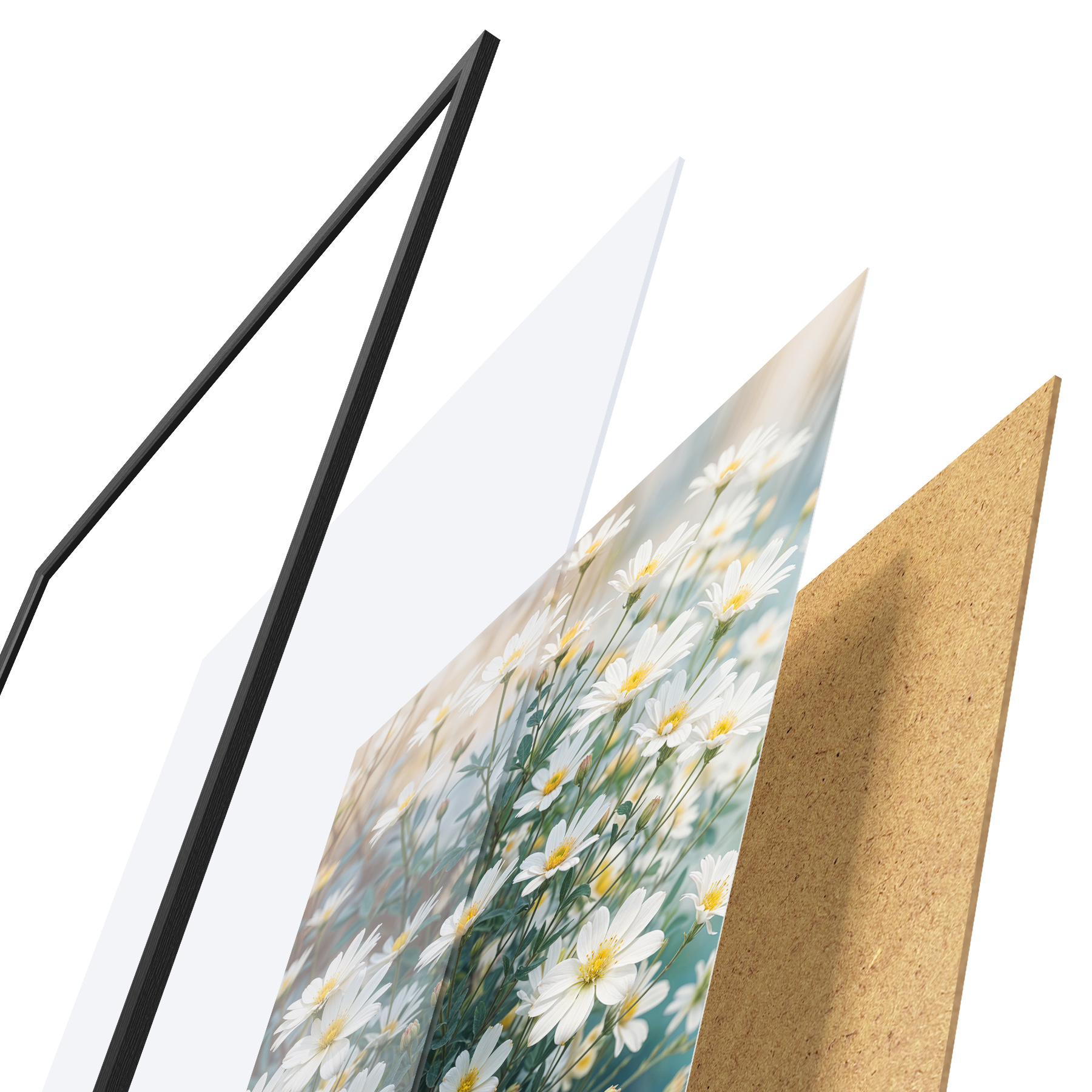 De poster bestaat uit een frame, plexiglas, geprinte afbeelding en spaanplaat achterkant. De poster kan meteen aan de muur worden gehangen dankzij de bevestigingen op de achterkant.