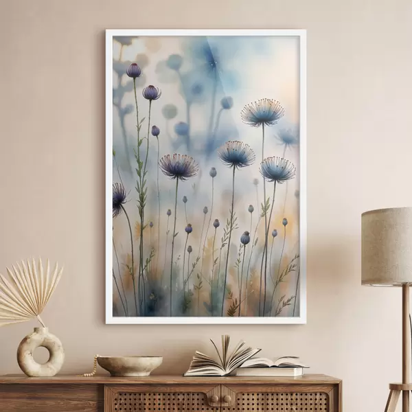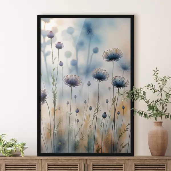 Poster Hoge paarse paardenbloemachtige bloemen met een wazige achtergrond, die een serene en dromerige sfeer creëren Nr f40414