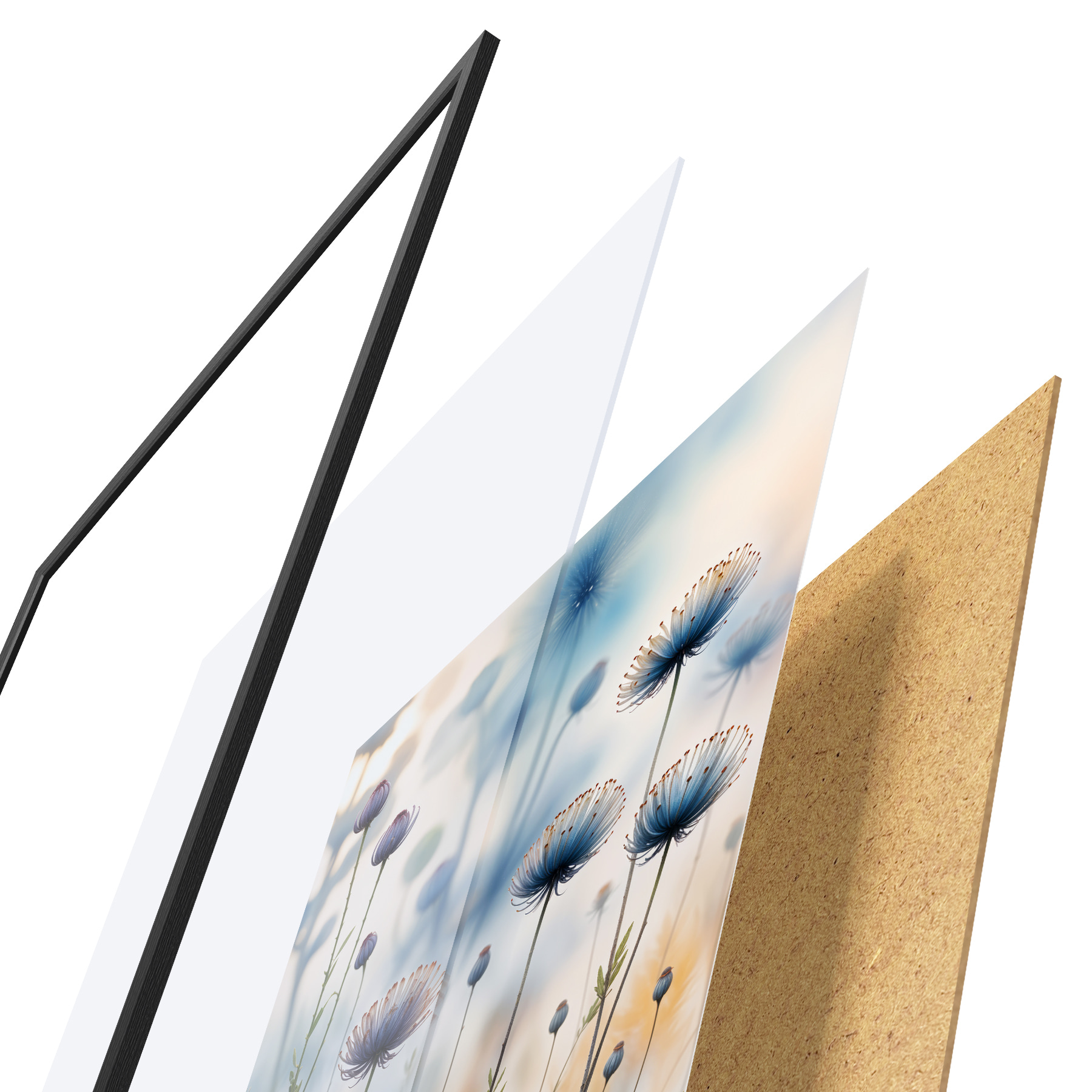De poster bestaat uit een frame, plexiglas, geprinte afbeelding en spaanplaat achterkant. De poster kan meteen aan de muur worden gehangen dankzij de bevestigingen op de achterkant.