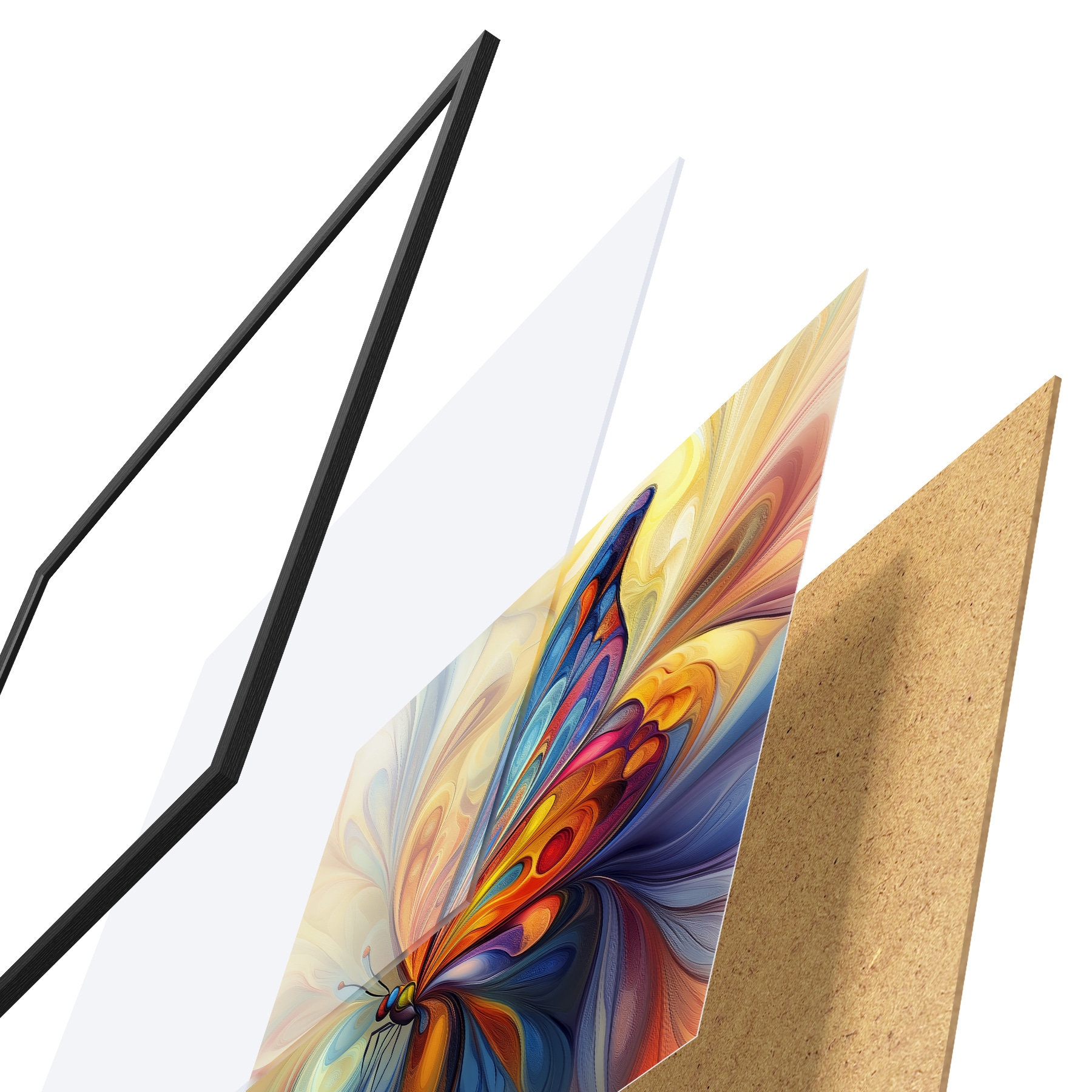 De poster bestaat uit een frame, plexiglas, geprinte afbeelding en spaanplaat achterkant. De poster kan meteen aan de muur worden gehangen dankzij de bevestigingen op de achterkant.