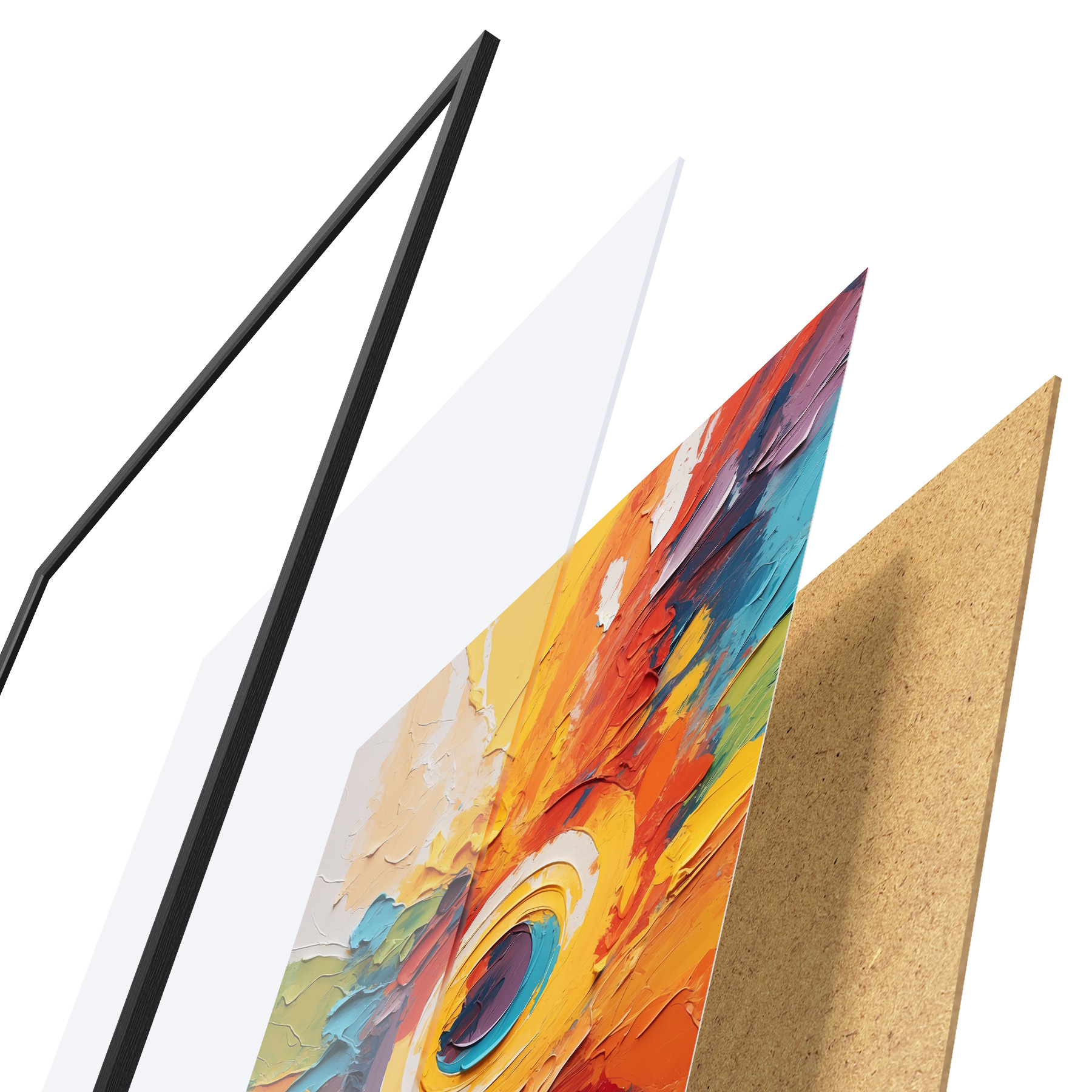 De poster bestaat uit een frame, plexiglas, geprinte afbeelding en spaanplaat achterkant. De poster kan meteen aan de muur worden gehangen dankzij de bevestigingen op de achterkant.