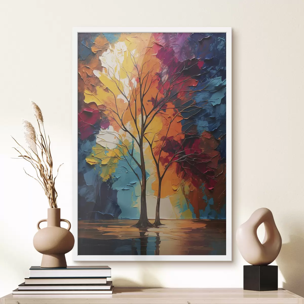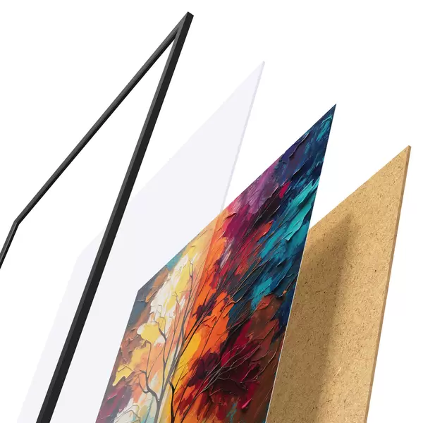 De poster bestaat uit een frame, plexiglas, geprinte afbeelding en spaanplaat achterkant. De poster kan meteen aan de muur worden gehangen dankzij de bevestigingen op de achterkant.