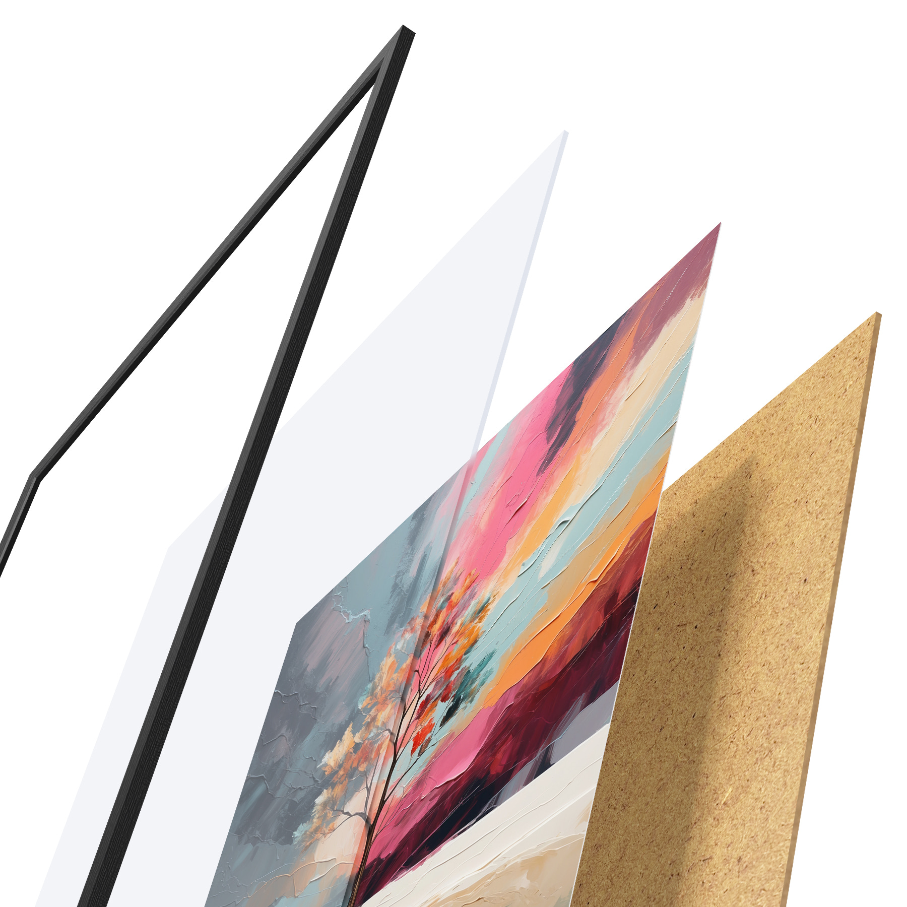 De poster bestaat uit een frame, plexiglas, geprinte afbeelding en spaanplaat achterkant. De poster kan meteen aan de muur worden gehangen dankzij de bevestigingen op de achterkant.