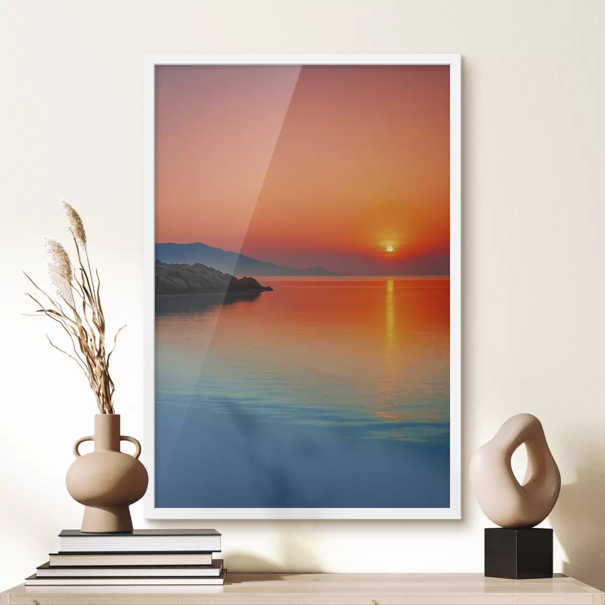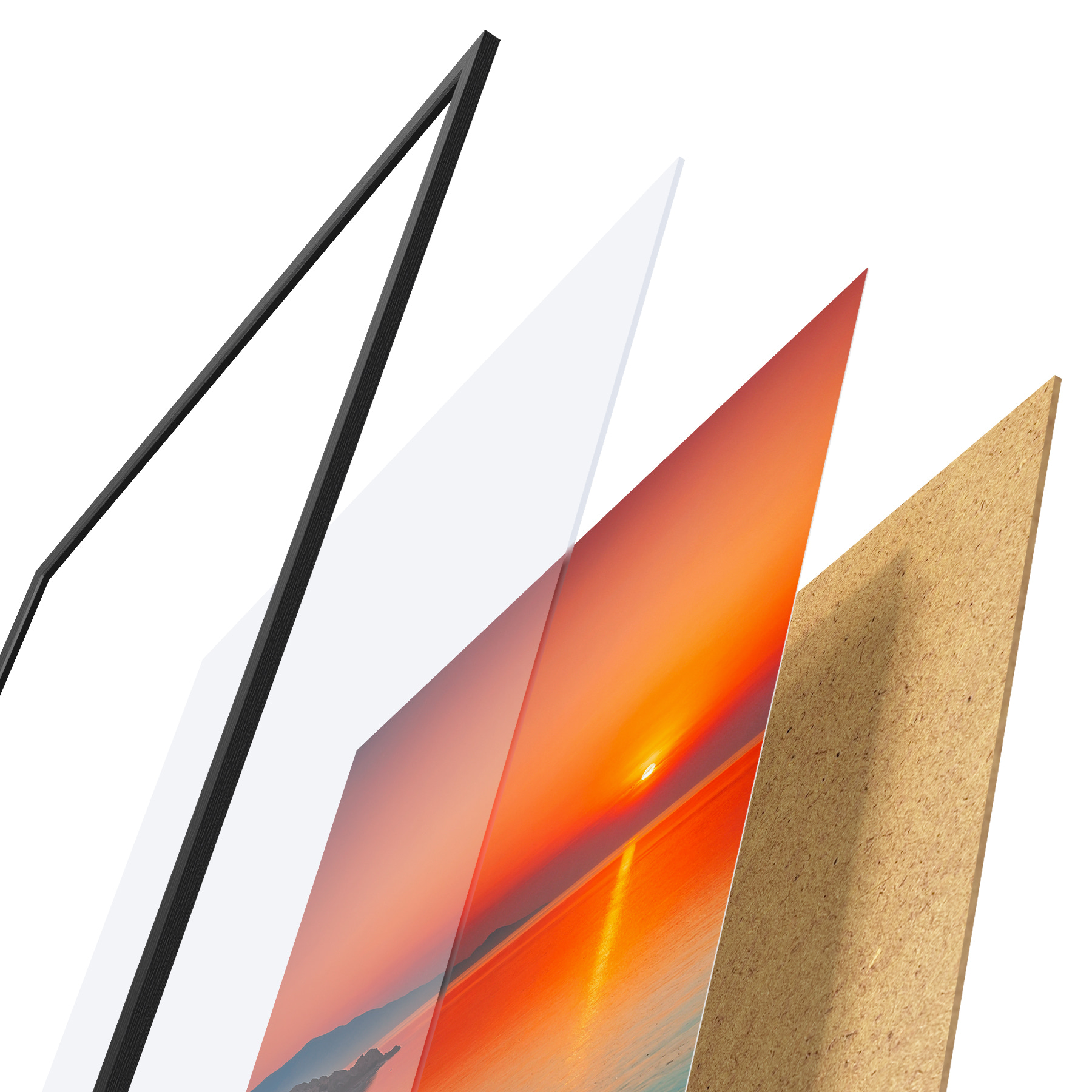 De poster bestaat uit een frame, plexiglas, geprinte afbeelding en spaanplaat achterkant. De poster kan meteen aan de muur worden gehangen dankzij de bevestigingen op de achterkant.