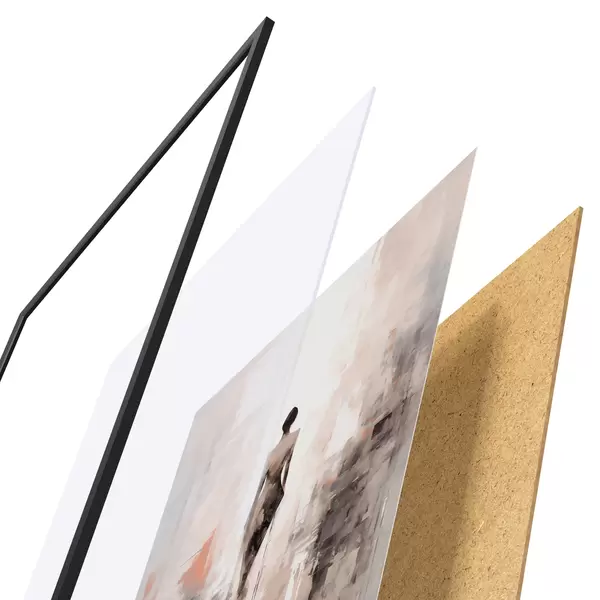 De poster bestaat uit een frame, plexiglas, geprinte afbeelding en spaanplaat achterkant. De poster kan meteen aan de muur worden gehangen dankzij de bevestigingen op de achterkant.