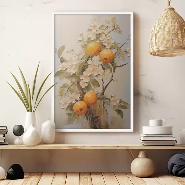 Poster Tak met witte bloemen en sinaasappels op een grijsbeige achtergrond Nr f40486