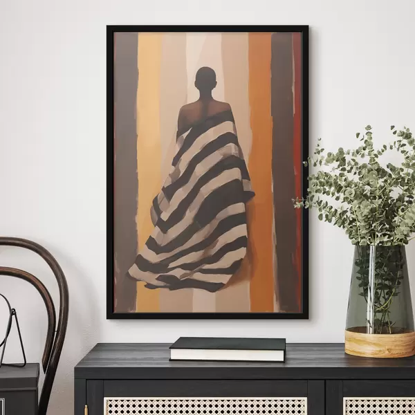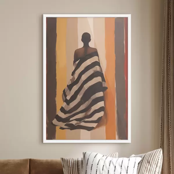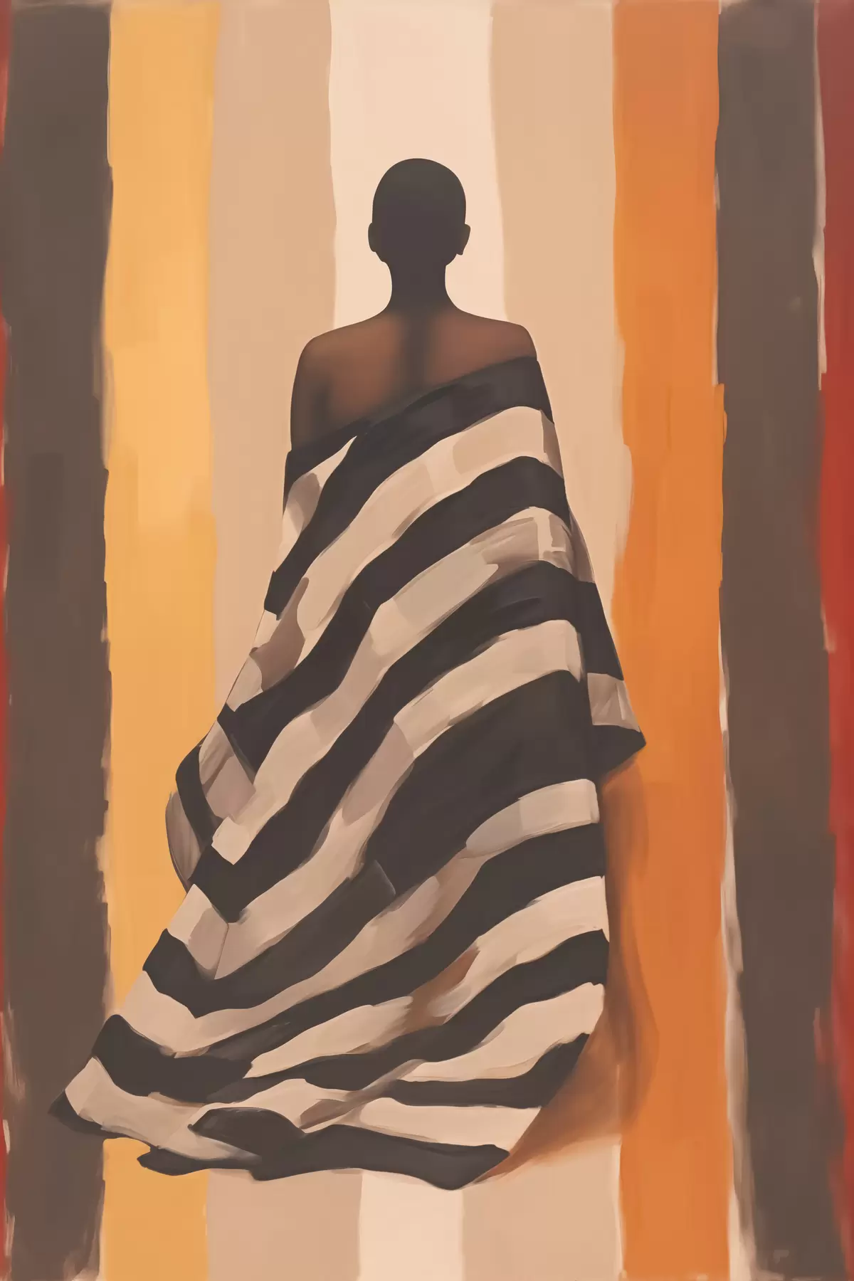 Poster Silhouet van een Afro-Amerikaanse vrouw in een gestreepte cape op een achtergrond met verticale strepen, zwart, beige, geel, rood, bruin Nr f40487