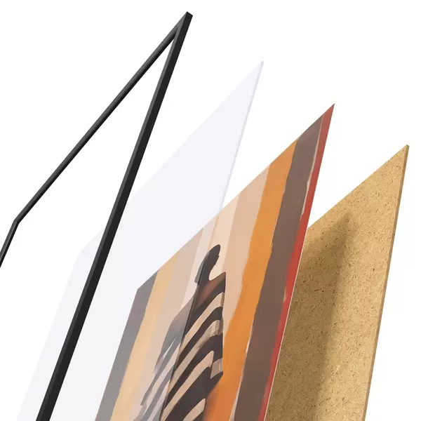De poster bestaat uit een frame, plexiglas, geprinte afbeelding en spaanplaat achterkant. De poster kan meteen aan de muur worden gehangen dankzij de bevestigingen op de achterkant.
