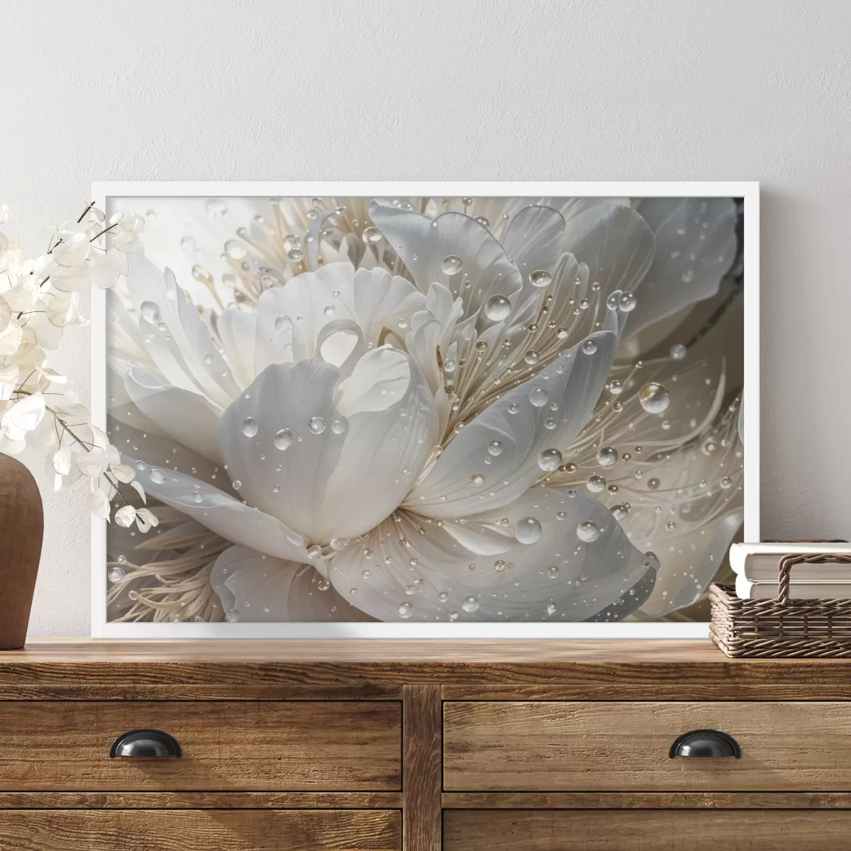 Poster Een close-up van een witte pioenroos met waterdruppels op de bloemblaadjes, tegen een wazige achtergrond Nr f40539
