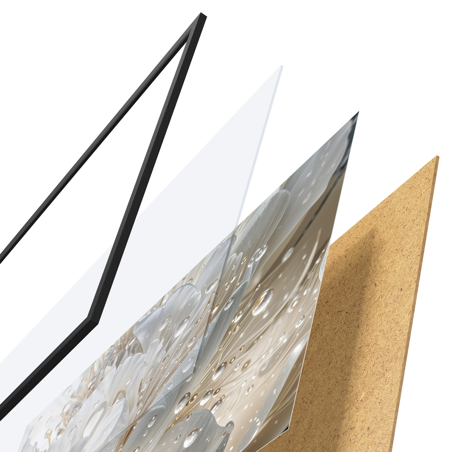De poster bestaat uit een frame, plexiglas, geprinte afbeelding en spaanplaat achterkant. De poster kan meteen aan de muur worden gehangen dankzij de bevestigingen op de achterkant.