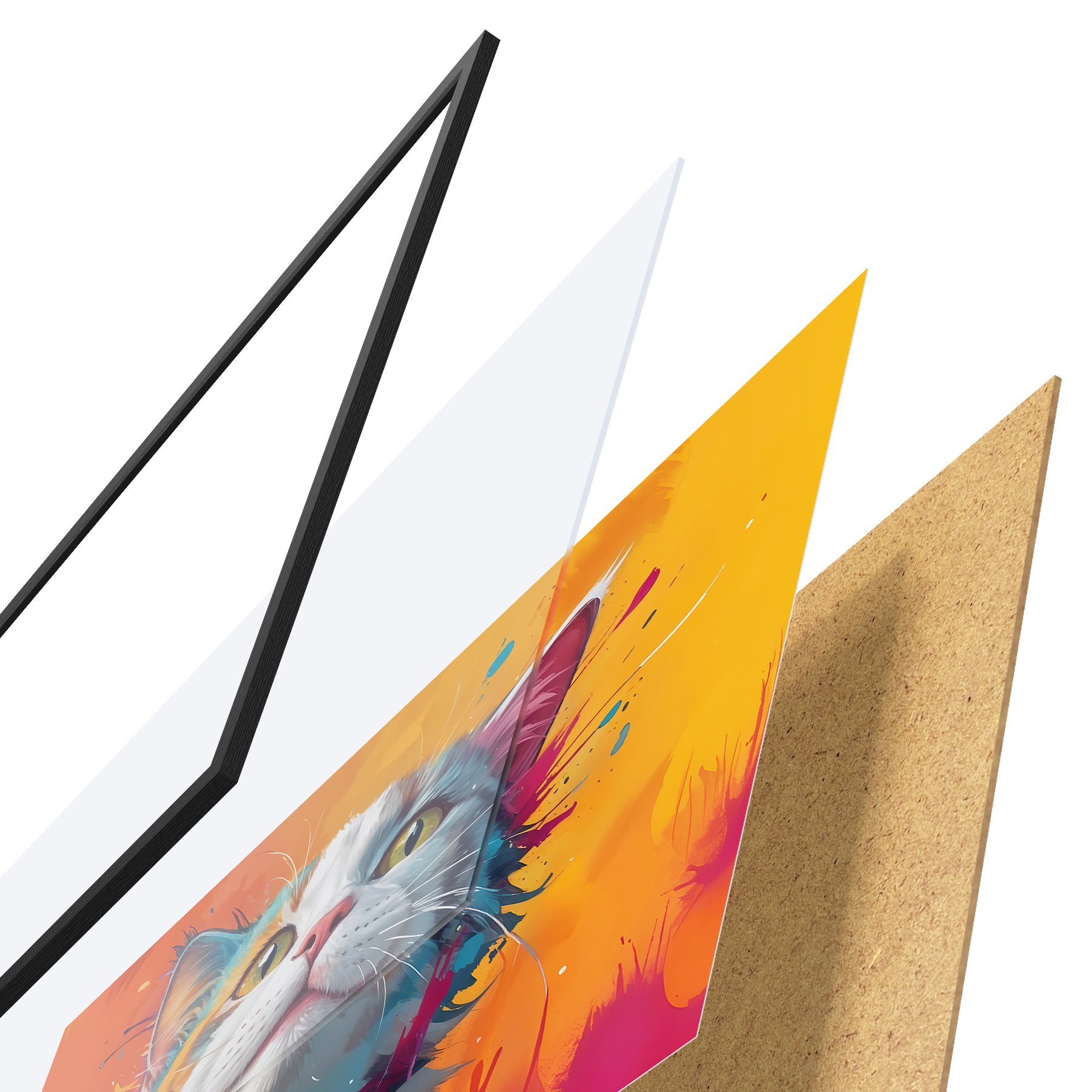Poster Een close-upportret van een witte en oranje tabby kat met levendige, kleurrijke verfspatten Nr f40547