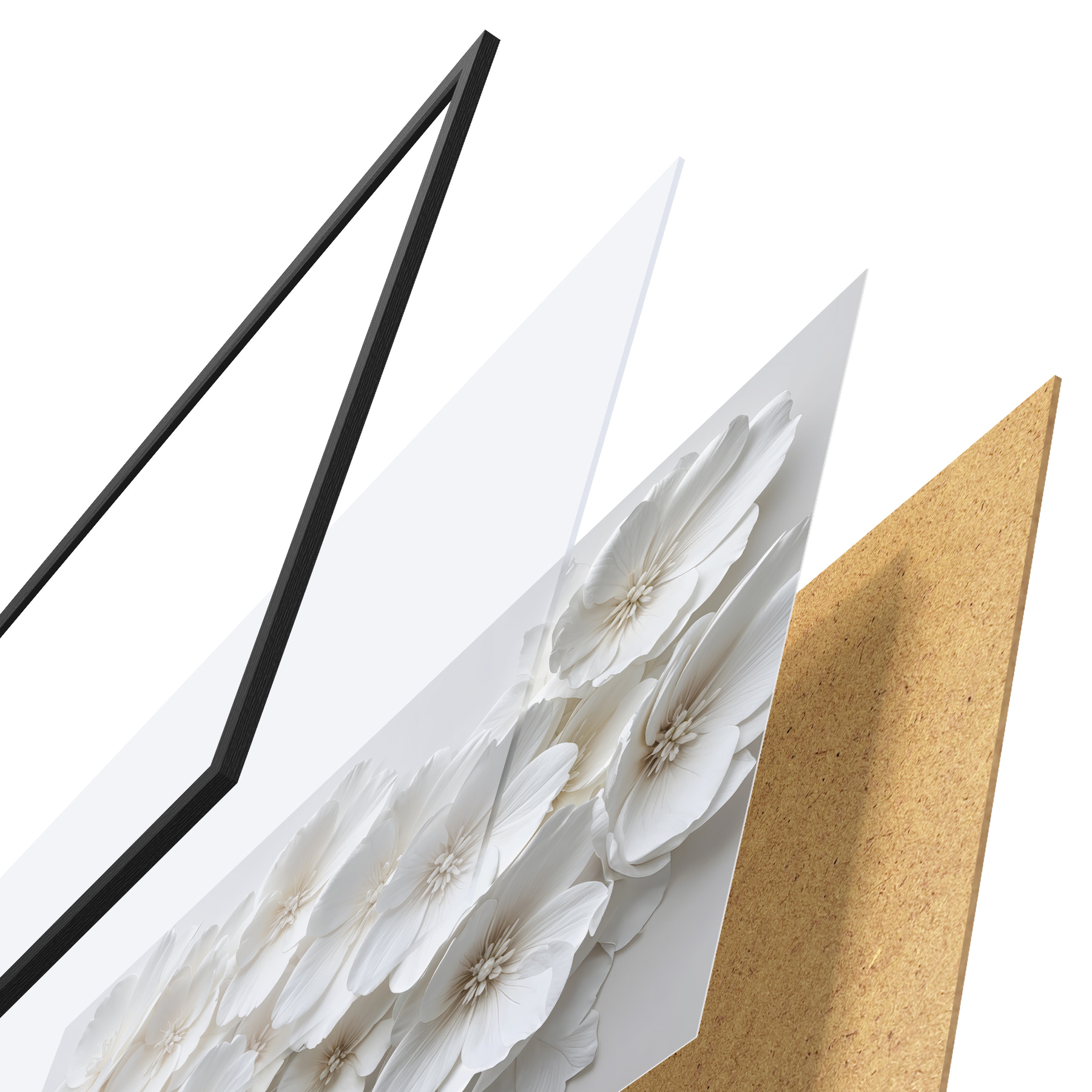 De poster bestaat uit een frame, plexiglas, geprinte afbeelding en spaanplaat achterkant. De poster kan meteen aan de muur worden gehangen dankzij de bevestigingen op de achterkant.