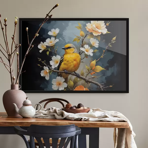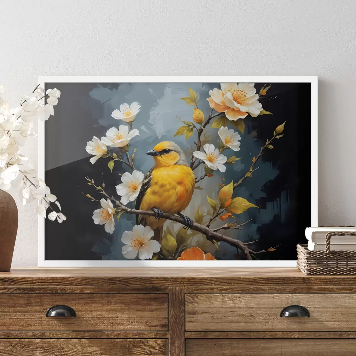 Poster Een gele vogel zit op een tak met witte en oranje bloemen op de achtergrond Nr f40550