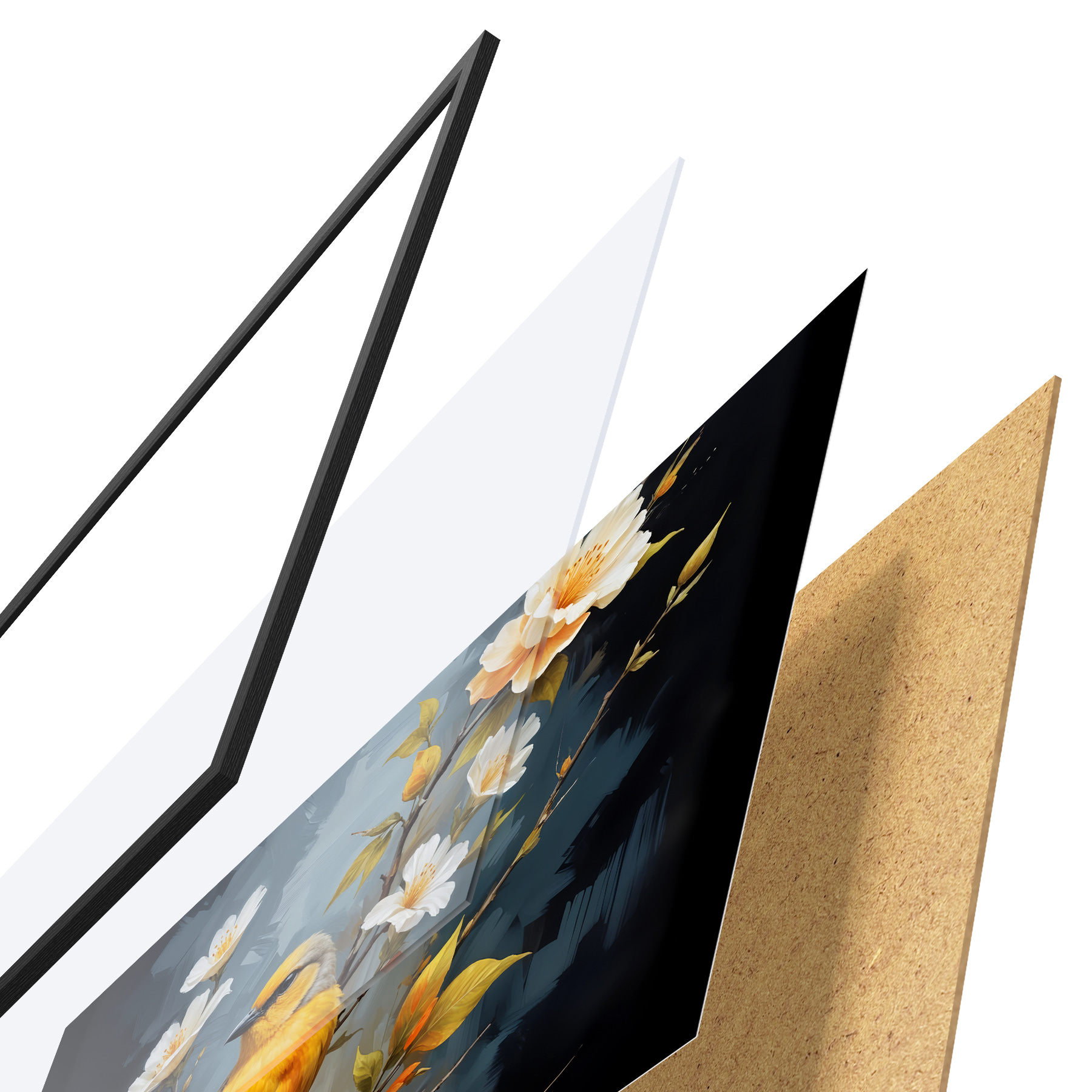 De poster bestaat uit een frame, plexiglas, geprinte afbeelding en spaanplaat achterkant. De poster kan meteen aan de muur worden gehangen dankzij de bevestigingen op de achterkant.