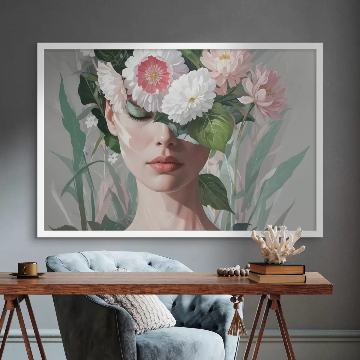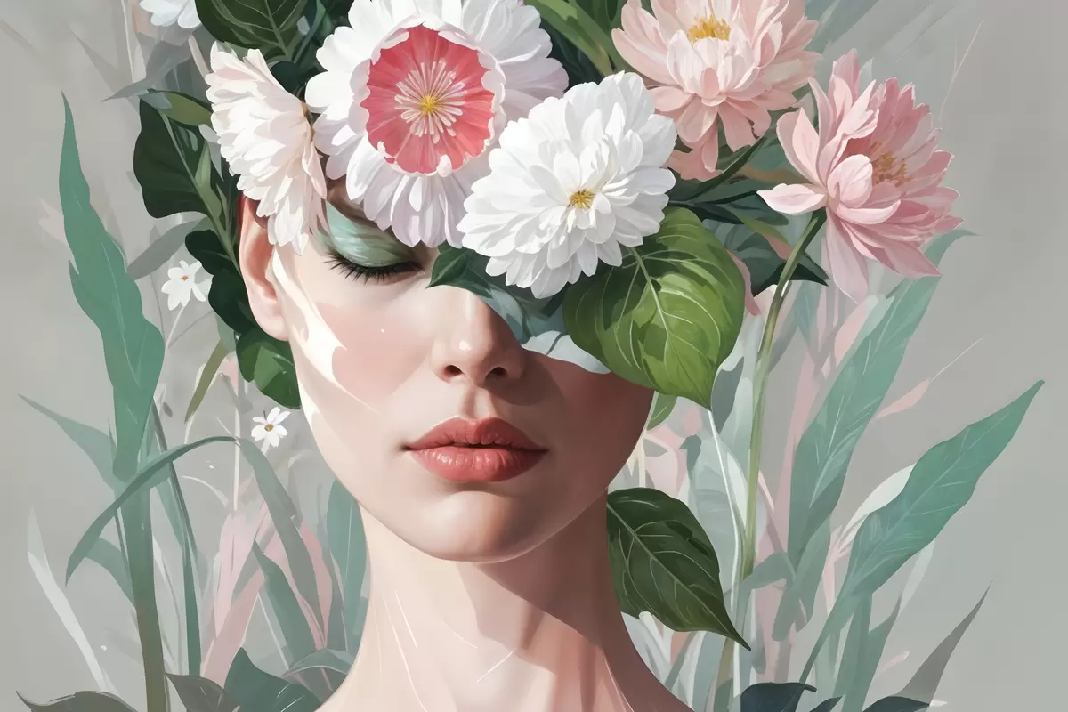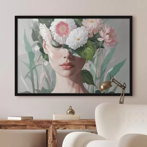 Poster Een vrouw gedeeltelijk verborgen door een boeket grote roze en witte bloemen tegen een groene, bladrijke achtergrond Nr f40567