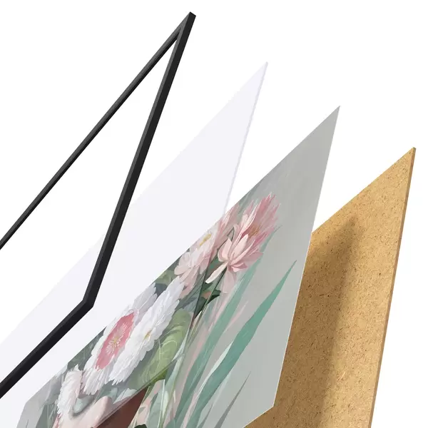 De poster bestaat uit een frame, plexiglas, geprinte afbeelding en spaanplaat achterkant. De poster kan meteen aan de muur worden gehangen dankzij de bevestigingen op de achterkant.