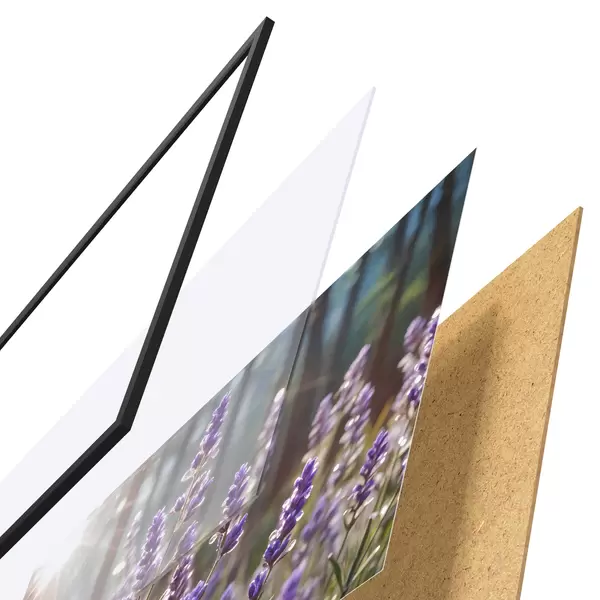 De poster bestaat uit een frame, plexiglas, geprinte afbeelding en spaanplaat achterkant. De poster kan meteen aan de muur worden gehangen dankzij de bevestigingen op de achterkant.