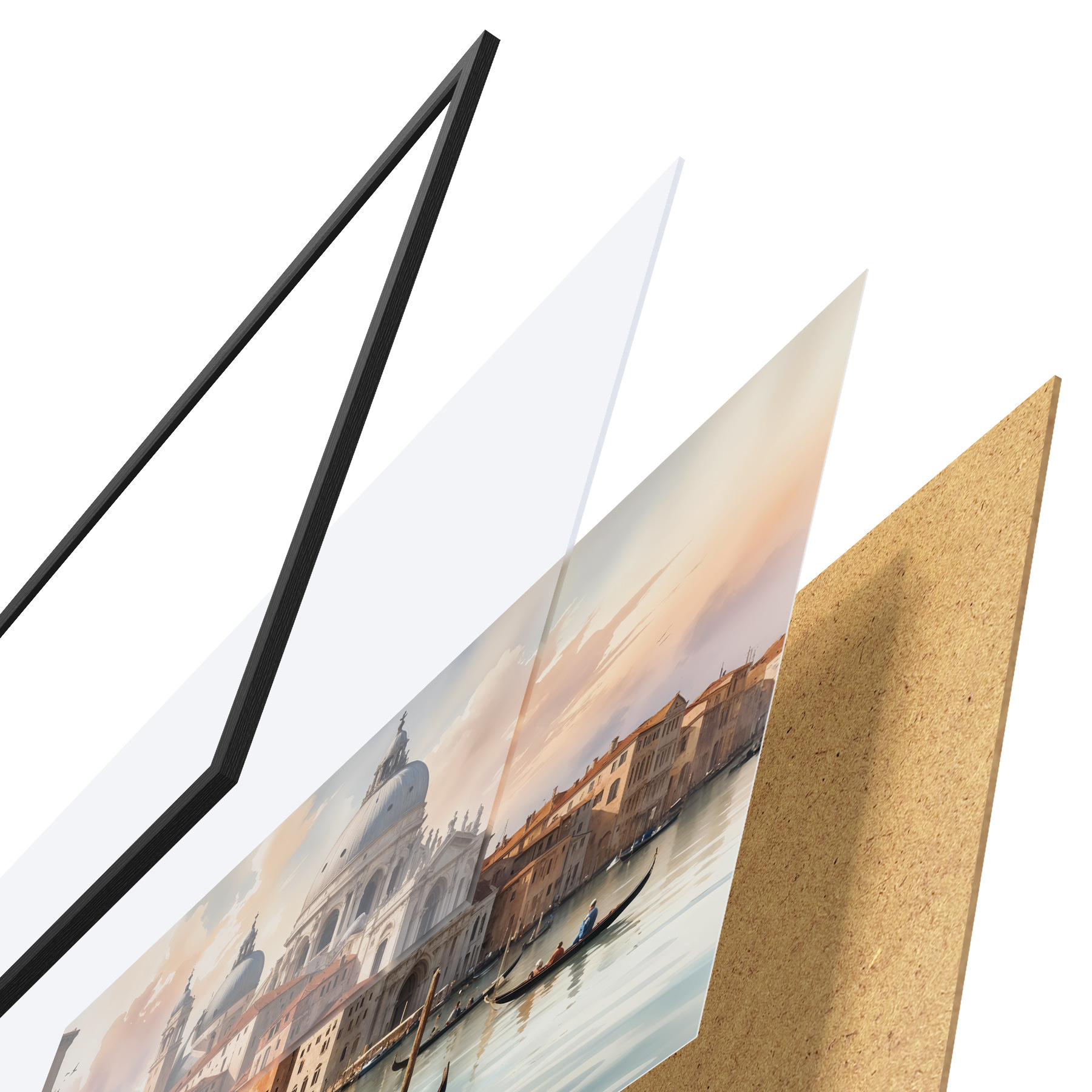 De poster bestaat uit een frame, plexiglas, geprinte afbeelding en spaanplaat achterkant. De poster kan meteen aan de muur worden gehangen dankzij de bevestigingen op de achterkant.