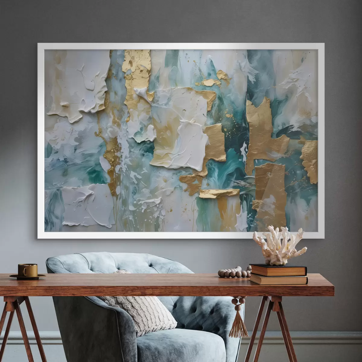 Poster Afbladderende verf met lagen van witte, blauwe en gele kleuren die een abstracte, gestructureerde afdruk creëren Nr f40577