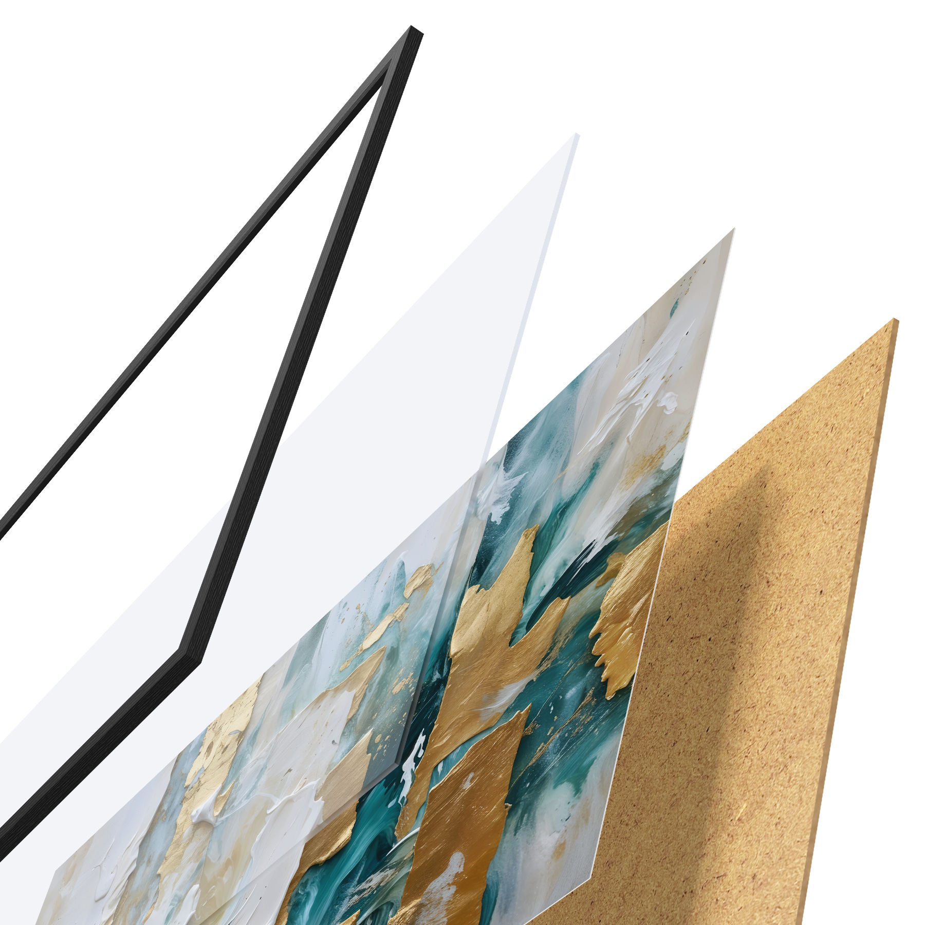 De poster bestaat uit een frame, plexiglas, geprinte afbeelding en spaanplaat achterkant. De poster kan meteen aan de muur worden gehangen dankzij de bevestigingen op de achterkant.