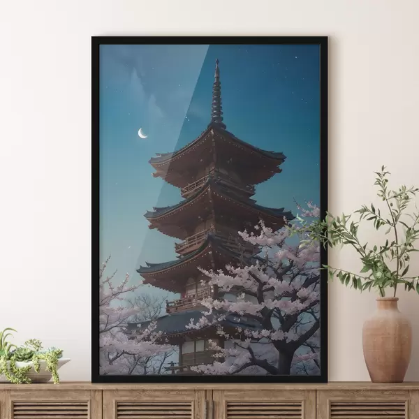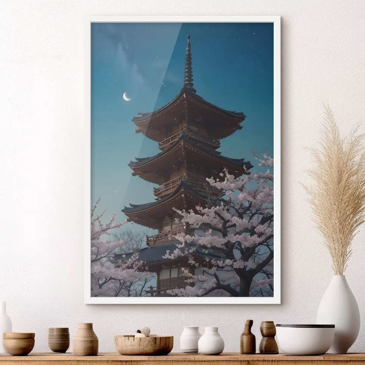 Poster Een traditionele Japanse pagode met een maansikkel aan de hemel en bloeiende kersenbloesembomen Nr f40586