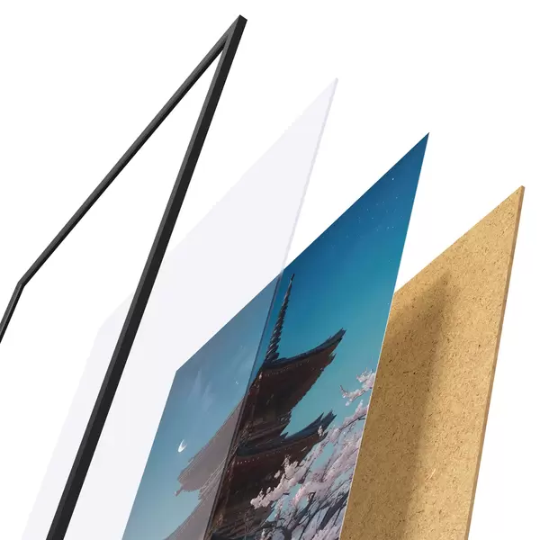De poster bestaat uit een frame, plexiglas, geprinte afbeelding en spaanplaat achterkant. De poster kan meteen aan de muur worden gehangen dankzij de bevestigingen op de achterkant.
