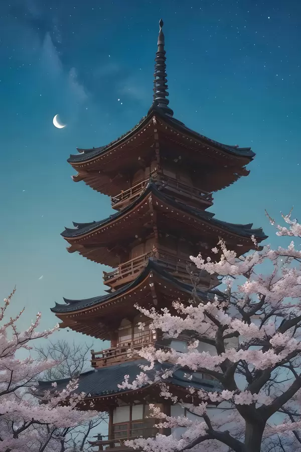 Poster Een traditionele Japanse pagode met een maansikkel aan de hemel en bloeiende kersenbloesembomen Nr f40586
