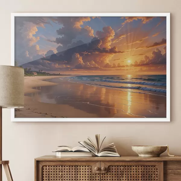 Poster Een dramatische zonsondergang boven een tropisch strand, met levendige oranje en roze wolken die weerspiegeld worden in het kalme water Nr f40599