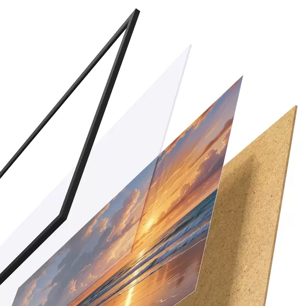 De poster bestaat uit een frame, plexiglas, geprinte afbeelding en spaanplaat achterkant. De poster kan meteen aan de muur worden gehangen dankzij de bevestigingen op de achterkant.