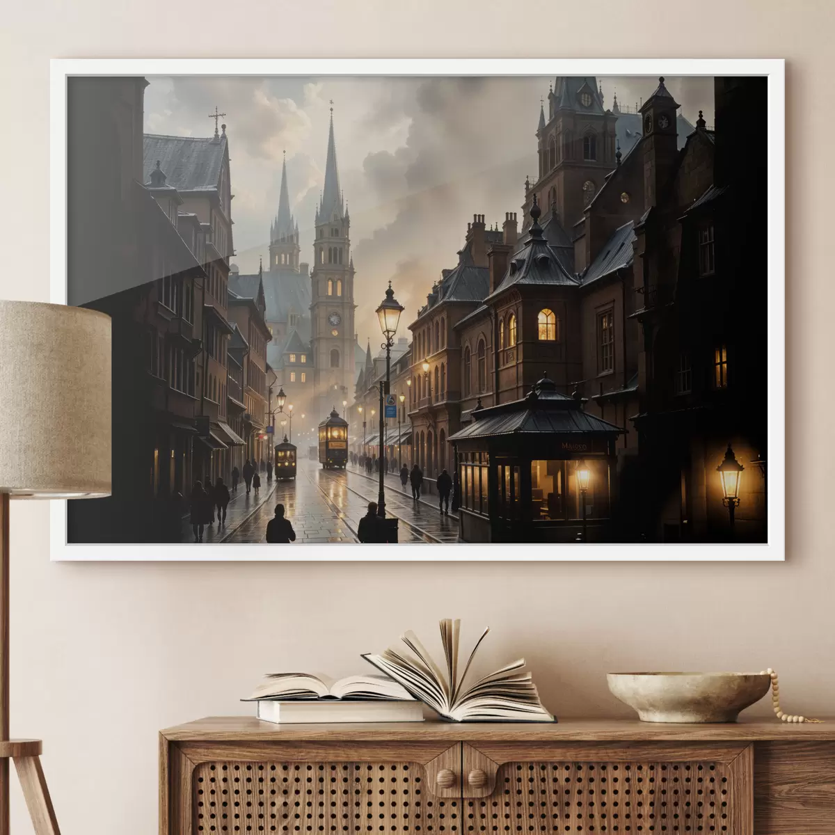 Poster Een regenachtige avond in een oude Europese stad, met geplaveide straten, historische gebouwen en een voorbijrijdende tram Nr f40604