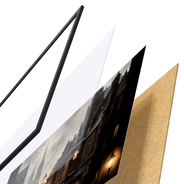 De poster bestaat uit een frame, plexiglas, geprinte afbeelding en spaanplaat achterkant. De poster kan meteen aan de muur worden gehangen dankzij de bevestigingen op de achterkant.