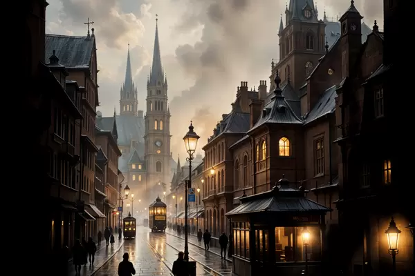 Poster Een regenachtige avond in een oude Europese stad, met geplaveide straten, historische gebouwen en een voorbijrijdende tram f40604