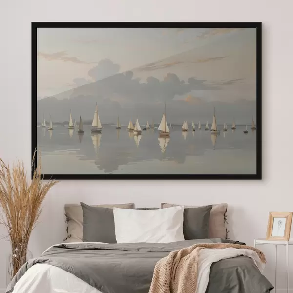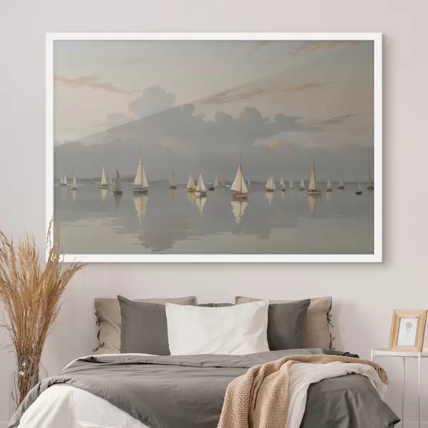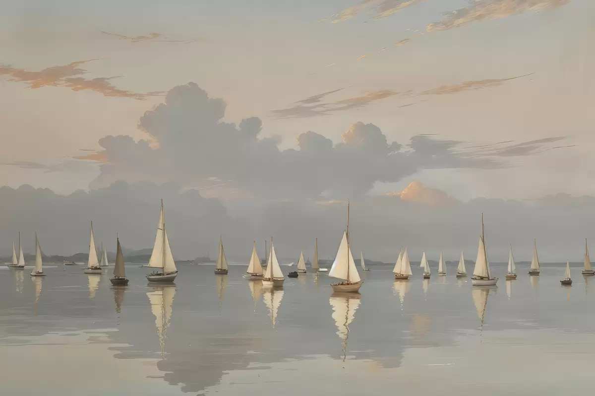 Poster Een vloot witte zeilboten op een kalm, weerspiegelend water bij zonsondergang, met een bewolkte lucht op de achtergrond Nr f40615