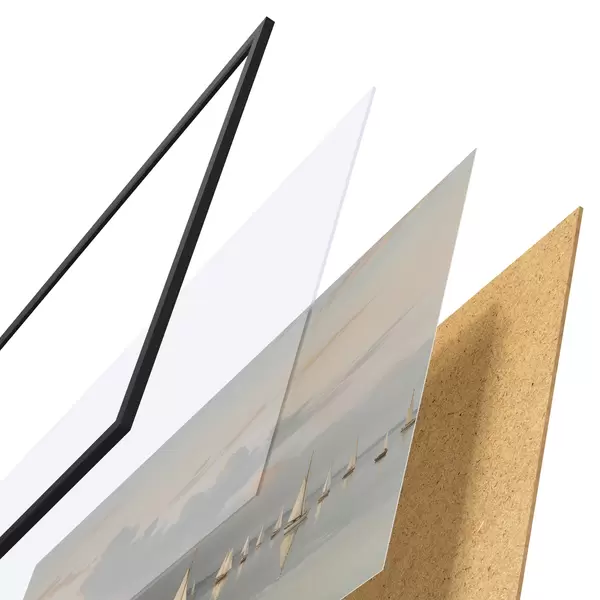 De poster bestaat uit een frame, plexiglas, geprinte afbeelding en spaanplaat achterkant. De poster kan meteen aan de muur worden gehangen dankzij de bevestigingen op de achterkant.