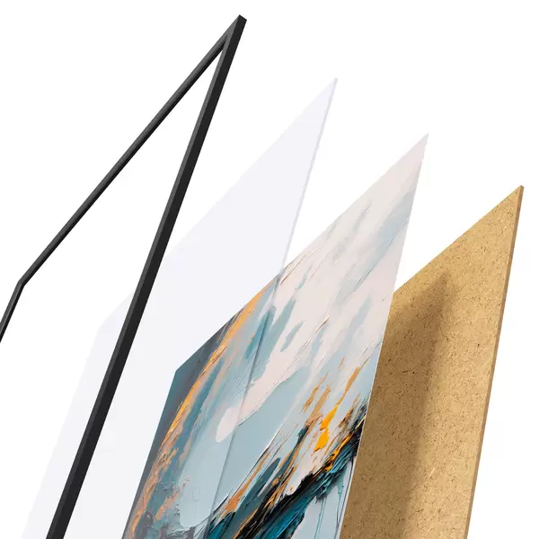 De poster bestaat uit een frame, plexiglas, geprinte afbeelding en spaanplaat achterkant. De poster kan meteen aan de muur worden gehangen dankzij de bevestigingen op de achterkant.