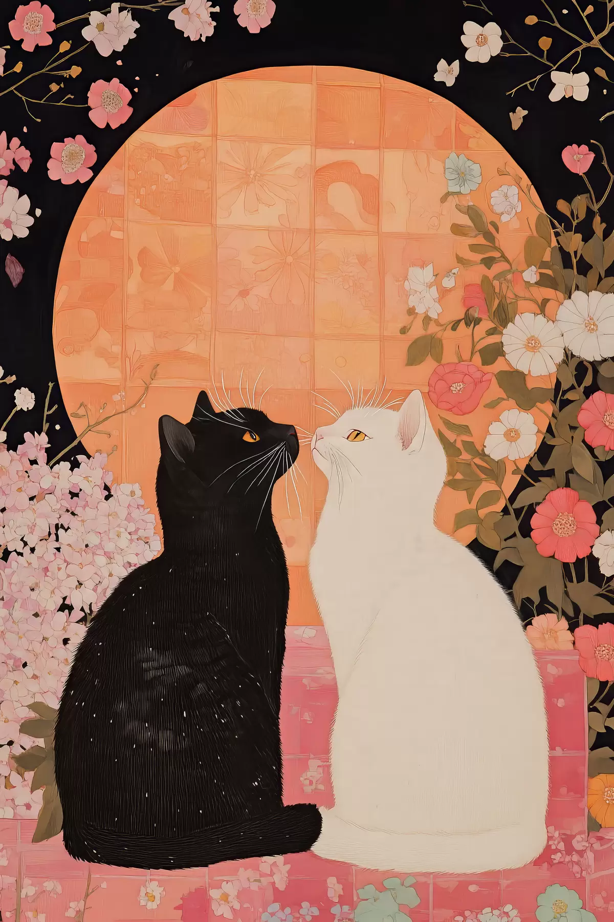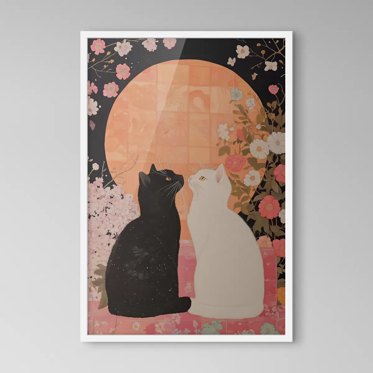 Poster Zwarte en witte kat kijken lief naar elkaar bij zonsondergang Nr f40669