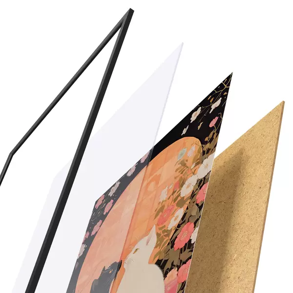 De poster bestaat uit een frame, plexiglas, geprinte afbeelding en spaanplaat achterkant. De poster kan meteen aan de muur worden gehangen dankzij de bevestigingen op de achterkant.