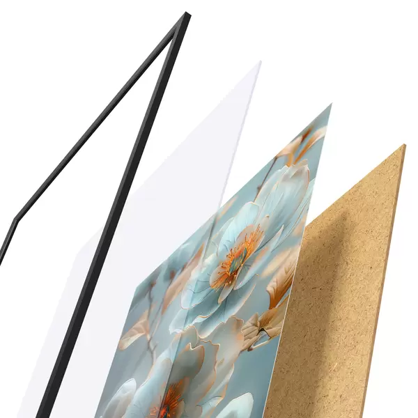 De poster bestaat uit een frame, plexiglas, geprinte afbeelding en spaanplaat achterkant. De poster kan meteen aan de muur worden gehangen dankzij de bevestigingen op de achterkant.