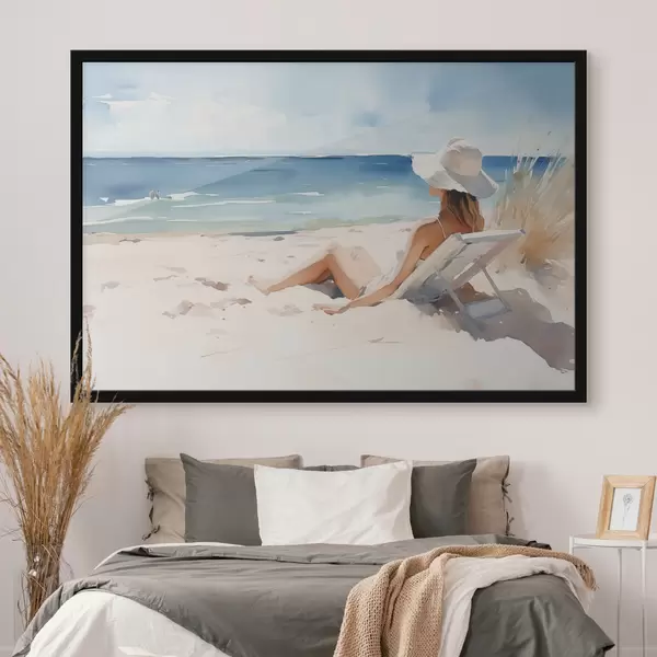Poster Meisje ontspannend op het strand bij de zee aquarel Nr f40679