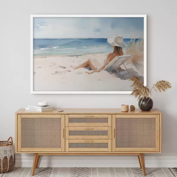 Poster Meisje ontspannend op het strand bij de zee aquarel f40679