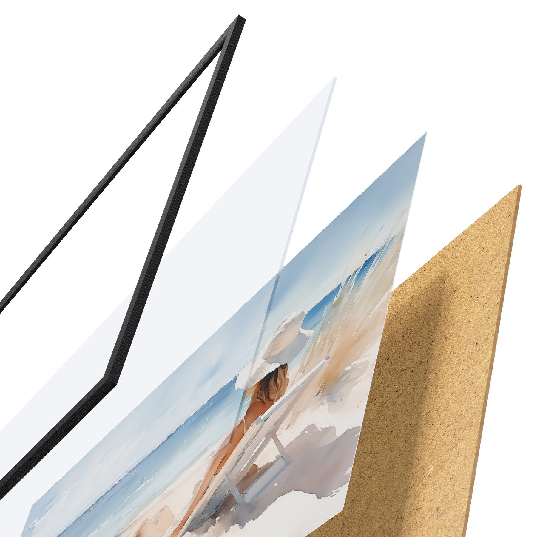 De poster bestaat uit een frame, plexiglas, geprinte afbeelding en spaanplaat achterkant. De poster kan meteen aan de muur worden gehangen dankzij de bevestigingen op de achterkant.