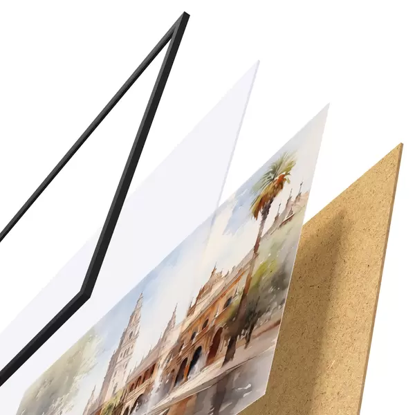 De poster bestaat uit een frame, plexiglas, geprinte afbeelding en spaanplaat achterkant. De poster kan meteen aan de muur worden gehangen dankzij de bevestigingen op de achterkant.
